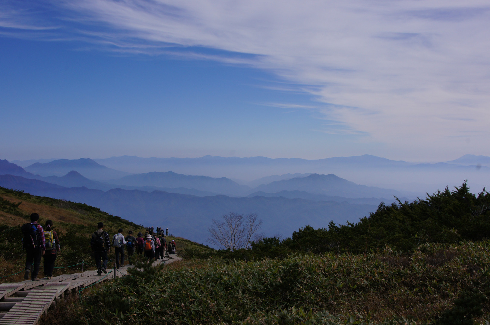八方尾根の戻り道。霞む南アルプスなどの山々を見下ろし、天空を歩く気分でした。