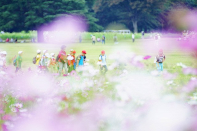 小学生の遠足かな?、楽しそうです。 こすもすに気が付いたかな?