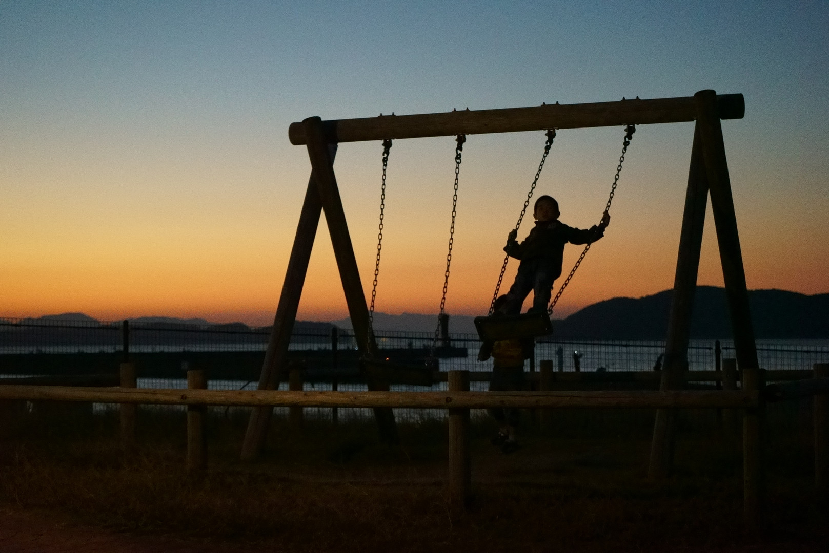 加太のくじら公園にて、夕暮れのブランコに全身全霊を傾ける少年。
