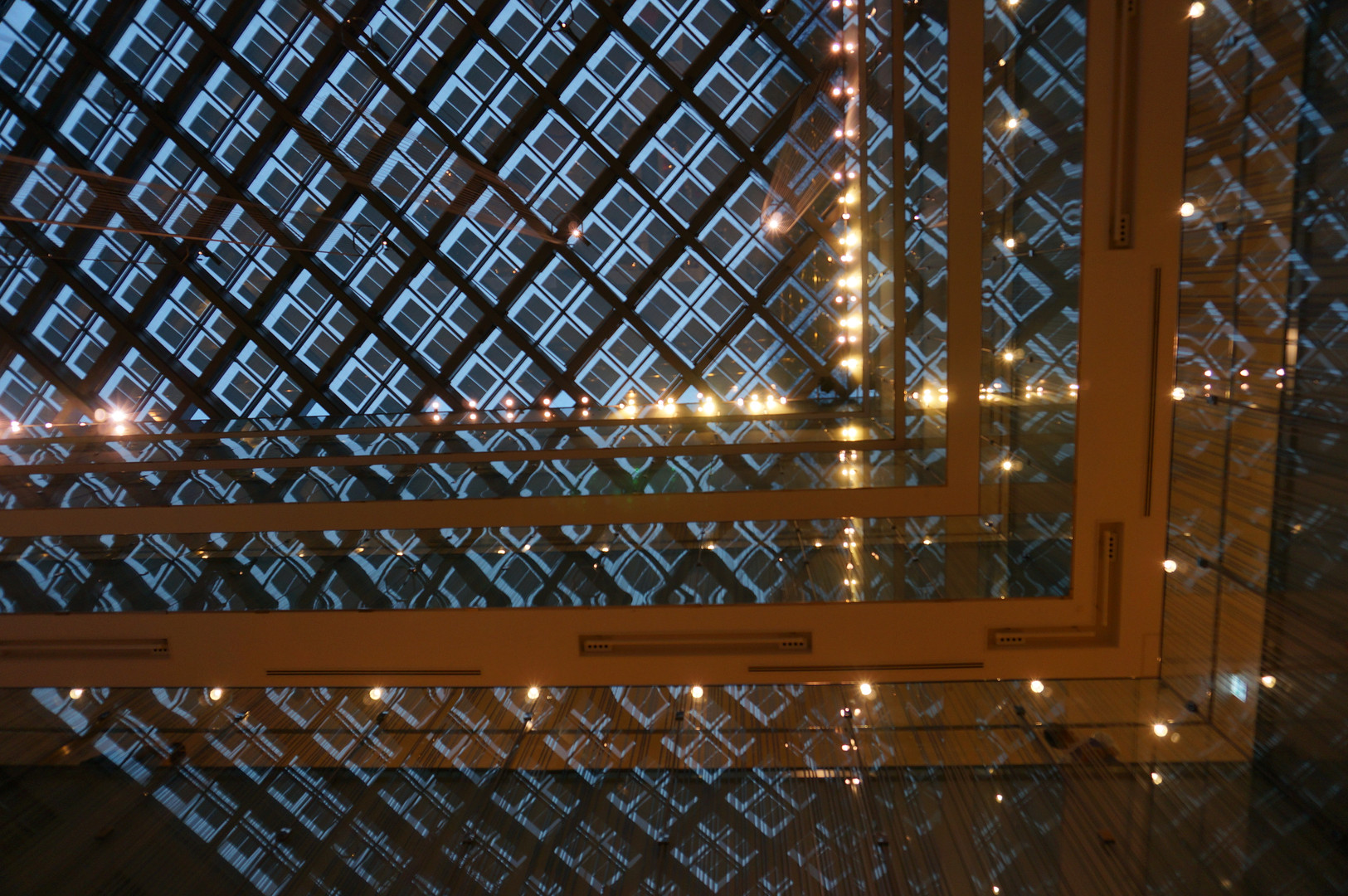 丸の内KITTEの天井です。 天井の格子と各フロアの壁の映りこみがおもしろくて撮ってみました。