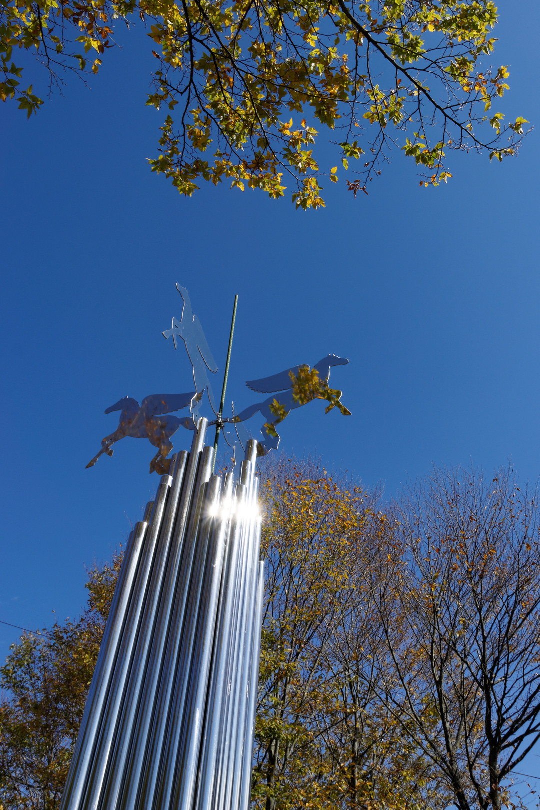 秋晴れのいいお天気、ふと見上げるとオブジェのペガサスに色づいた葉が映っていました。