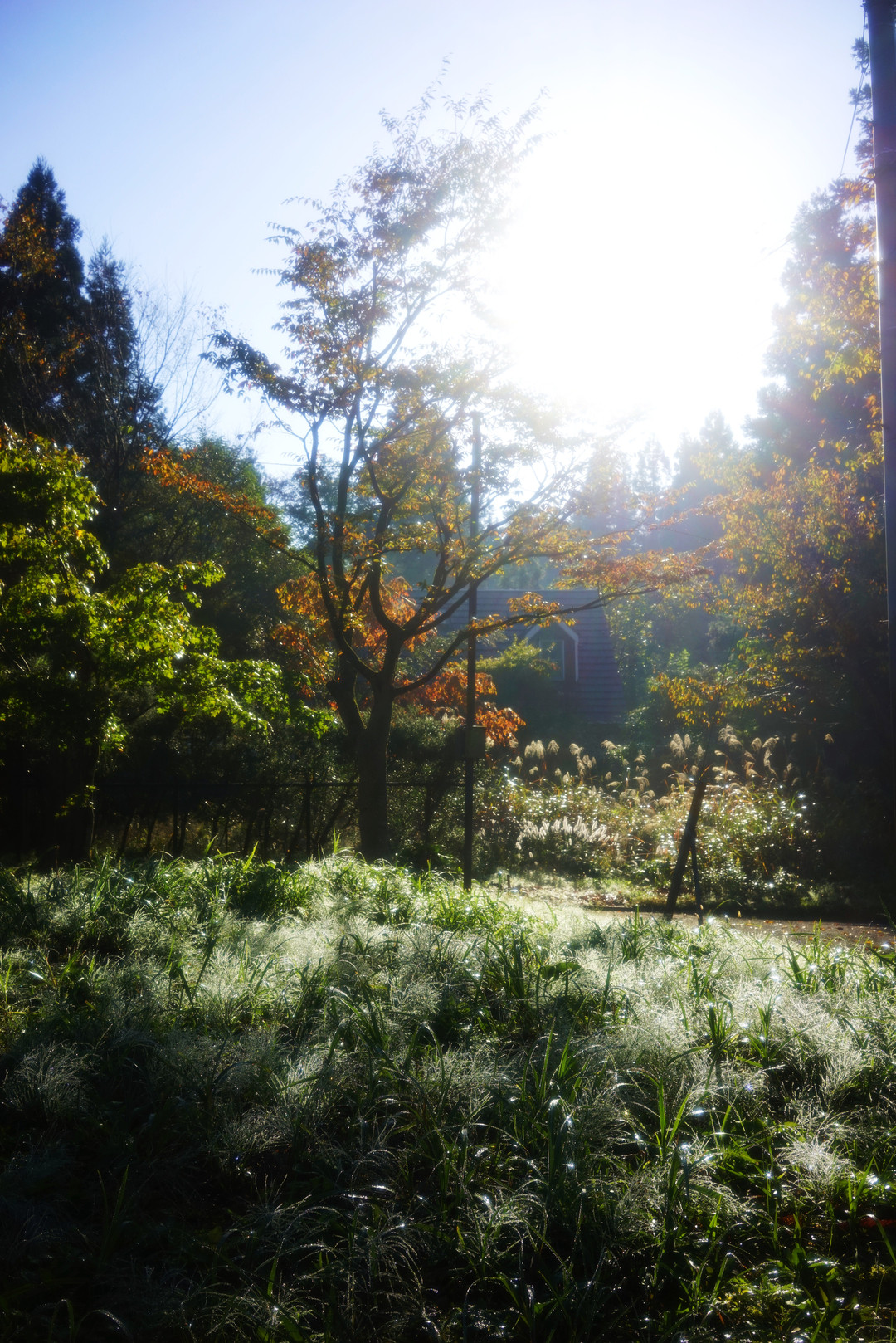 冬の訪れが近いこの頃。草木に付いた朝露に朝日が反射してとても綺麗でした♪