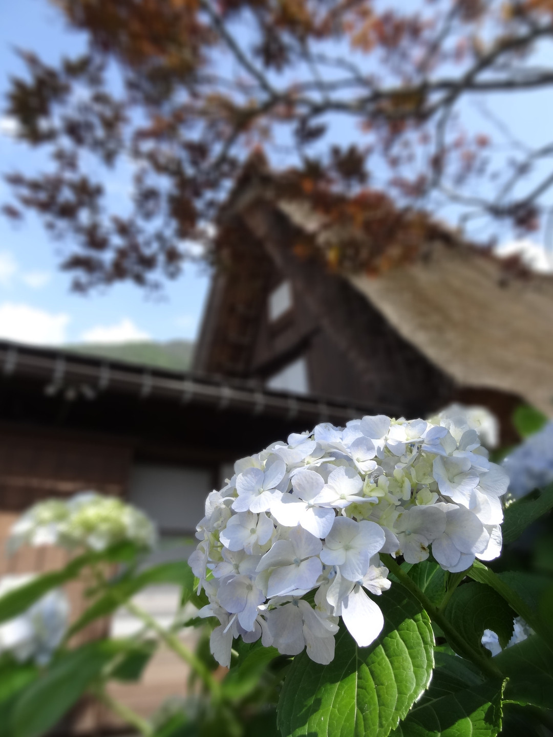 夏の白川郷、合掌造りの家屋を背に...