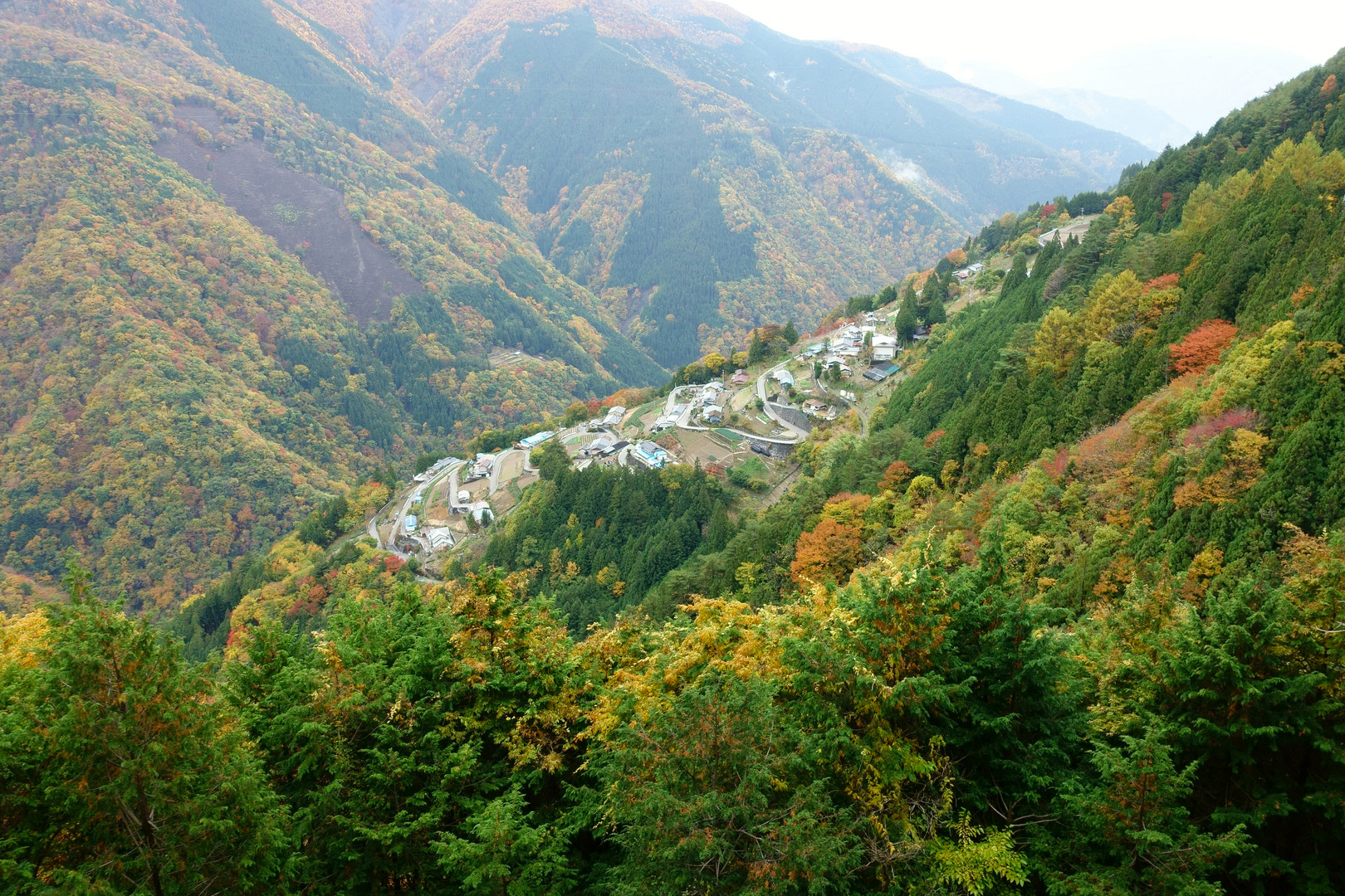 急斜面にへばりつくように存在する集落へたどり着くには、離合が困難なくねくね道を1時間以上走り、更にこの写真を撮ることのできるビューポイントへは人がすれ違うのも難しい山道を20分。