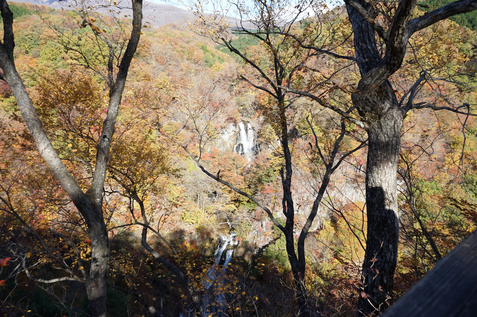 日光霧降滝で、逆光紅葉を撮りました。
