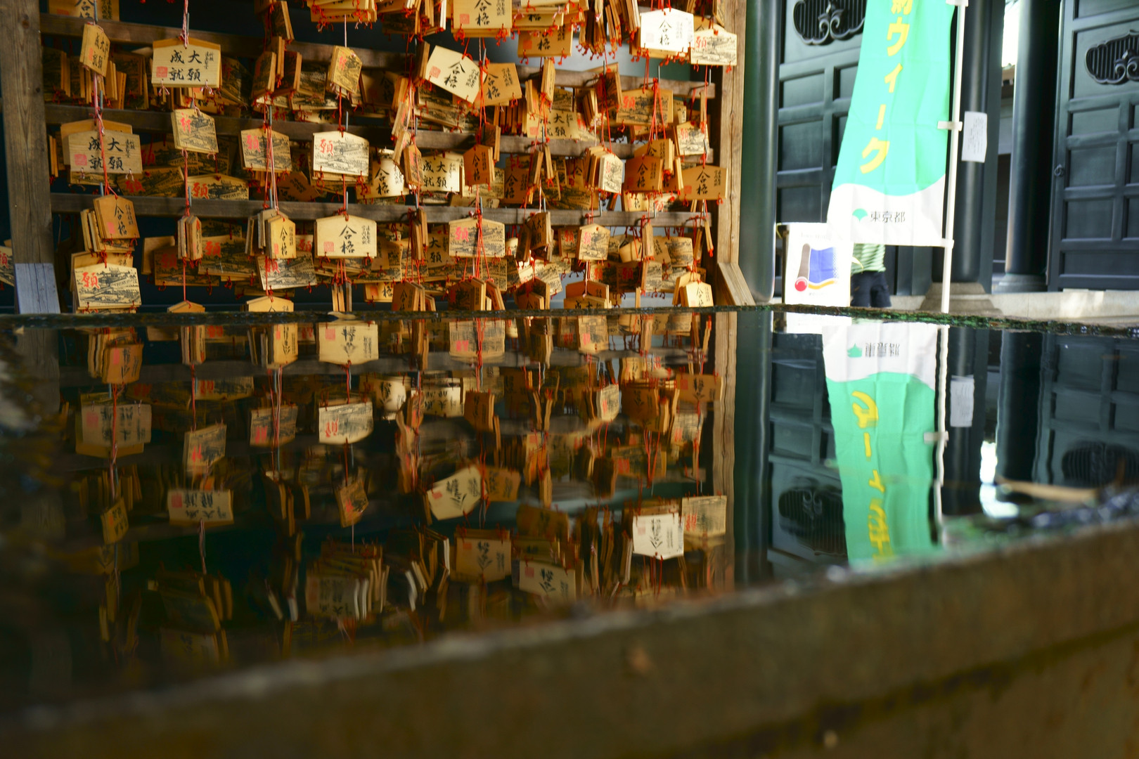 神社の絵馬が水面にきれいに映っていました。 後ろに旗が写ってしまったのが残念(+o+)