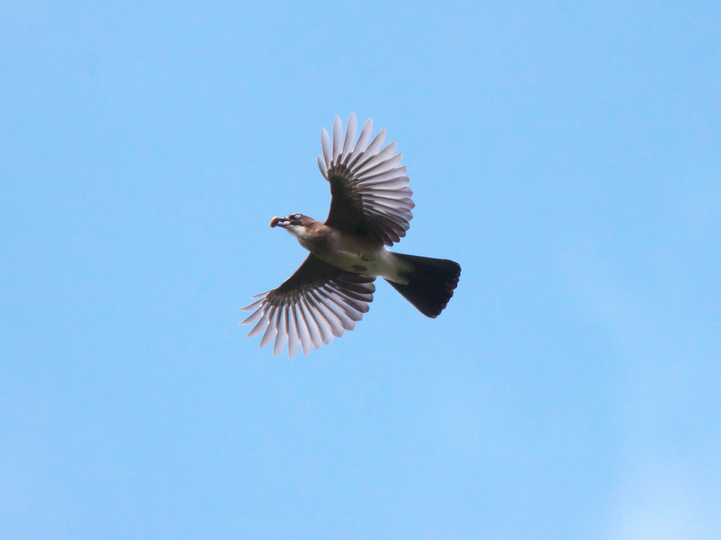 青空を背景にしたカケスがドングリをくわえた姿を狙っていました。 カケス君の口にはドングリが二つも・・