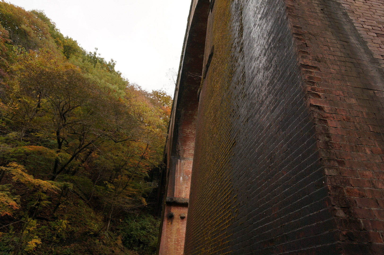 碓氷第三橋梁、通称「めがね橋」です。 このアングルからではどこが「めがね」なのか分かり難いですが、レンガの質感や苔の感じを出したくて、思いっきり寄ってみました。