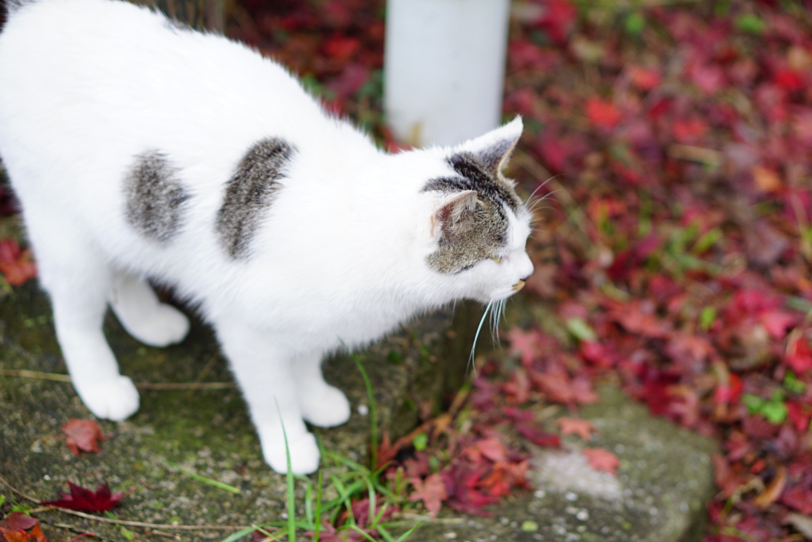 紅葉を撮りに行った場所で、たまたま出会った猫ちゃん。 赤い落ち葉と白い猫がコントラストっぽくなった…かな!?