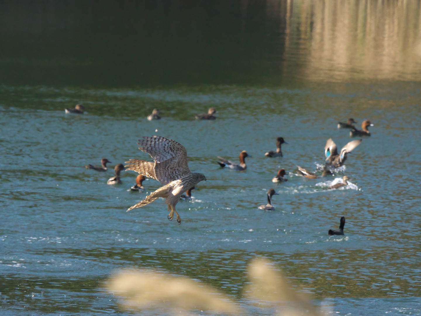 オオタカの若が鴨たちを狙って急襲。 まだ修行中のため、なかなか狩は成功しません。