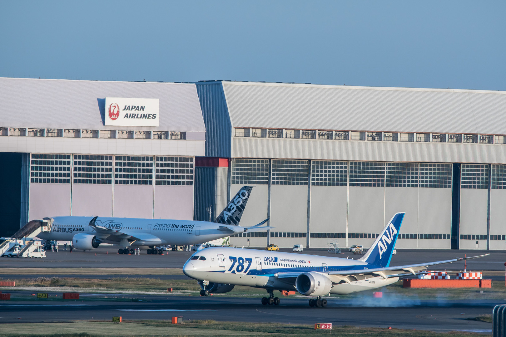 本日初来日したエアバスの新型機A350とボーイングの最新機B787とのコラボレーションです。 これからはこの2機が主流になってくるんでしょうね。