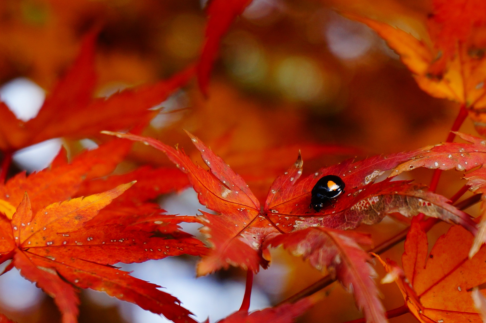 蒜山の紅葉を見に行ったときに、遊園地でみつけたテントウくん。 もみじの上のレッドカーペットを独り占めしていました。