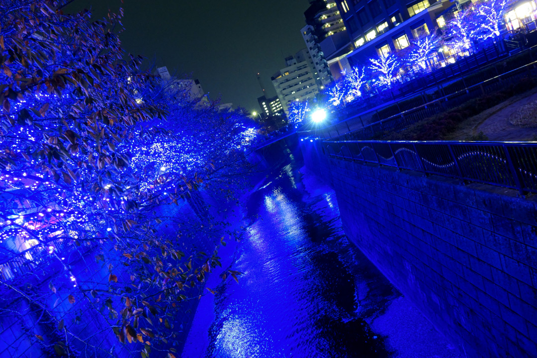 目黒川沿いの桜並木が今年もライトアップされました。距離は短いですが、一面青色の世界です。