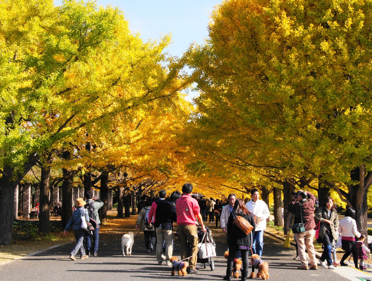 国営昭和記念公園の銀杏並木、圧巻でした!風もない暖かい日の日曜日、人人人、いろいろな犬種との出会い、黄葉の美しさも最高でした。
