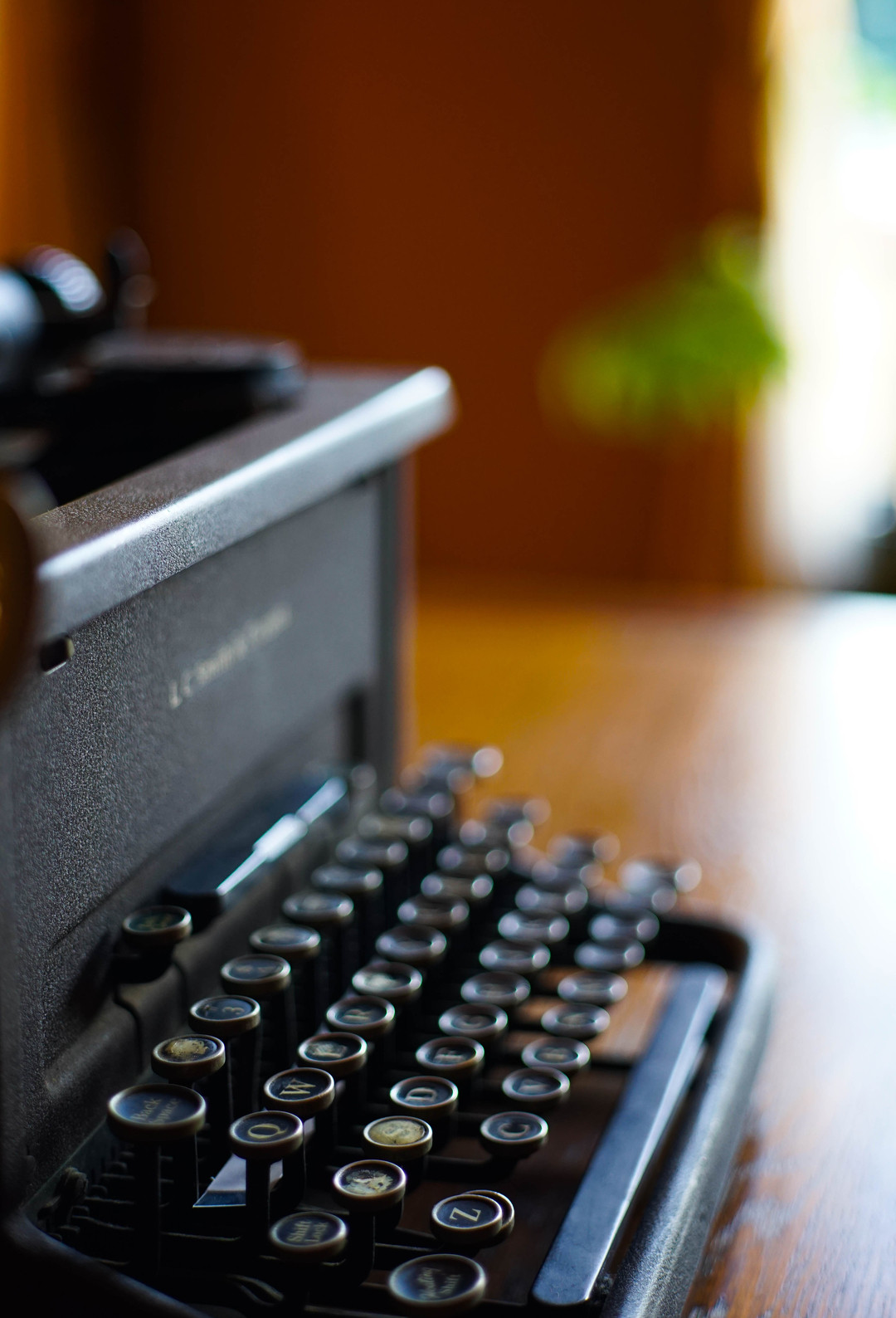 アンティークなタイプライターの手前のキイにピントを合わせて奥の植栽の緑をアクセントにしました。