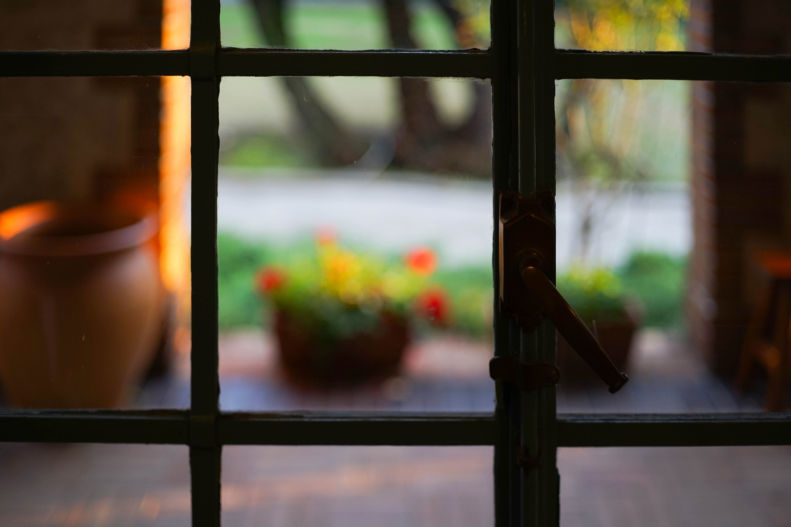 窓越しに花色と夕日の当たった光景に思わずパチリ!!