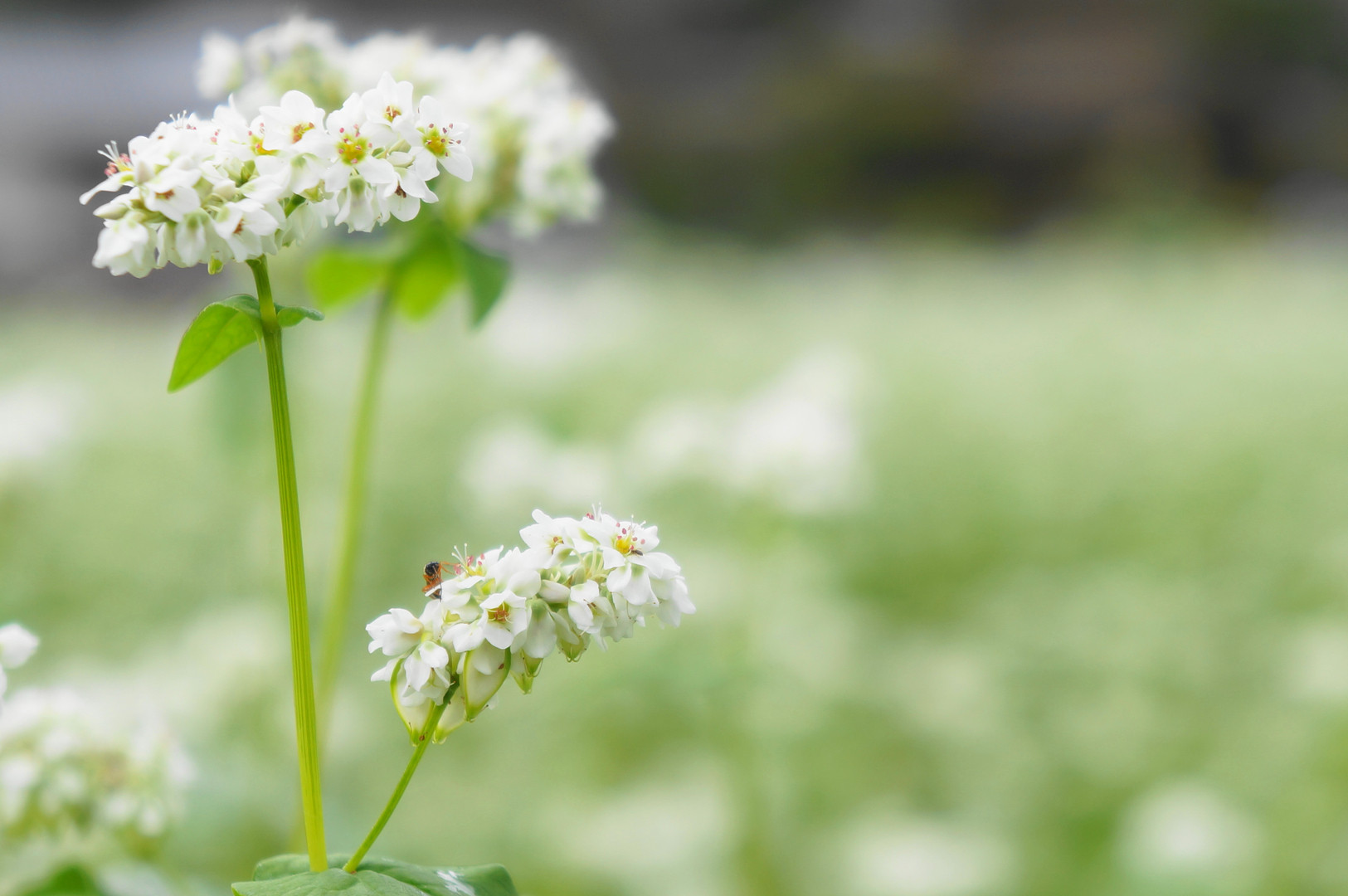 眼の前の蕎花にミツバチ?が... 狙ってではなく、現像時に気付いた偶然の賜物ですが(笑) ↑ミツバチ?アブ? どなたかご存知なら教えてください。