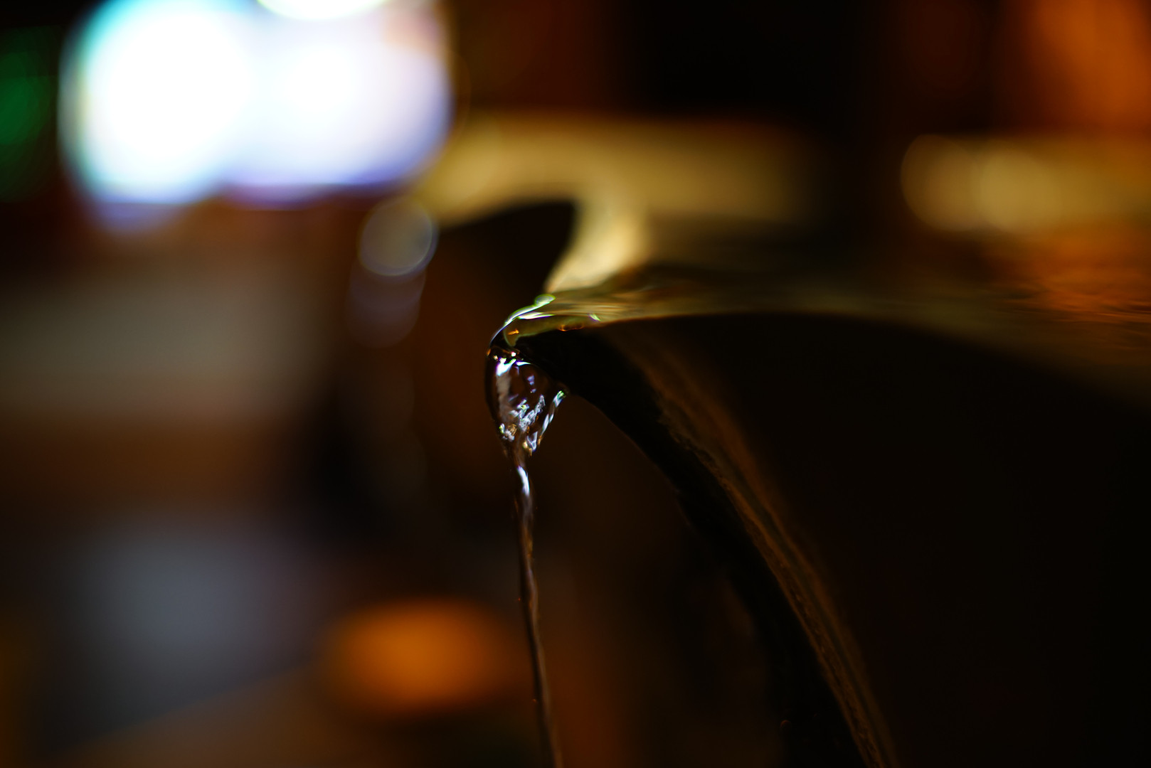 博多のお櫛田さん、夜のお詣りに来られる人もぼちぼち。お手水が流れ落ちる一本の小さな瀧。とっても澄んでいて、灯りに煌めいていましたのでパチリ。