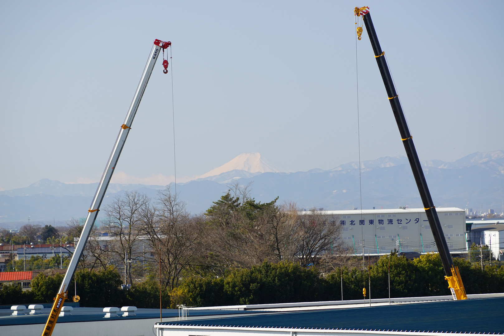 ビルの屋上から富士山を撮ろうと、カメラ一式+重い三脚担いで出勤したらこの日に限って工事のクレーンが.. ちょうど挟んだ位置だったので撮っちゃいました。