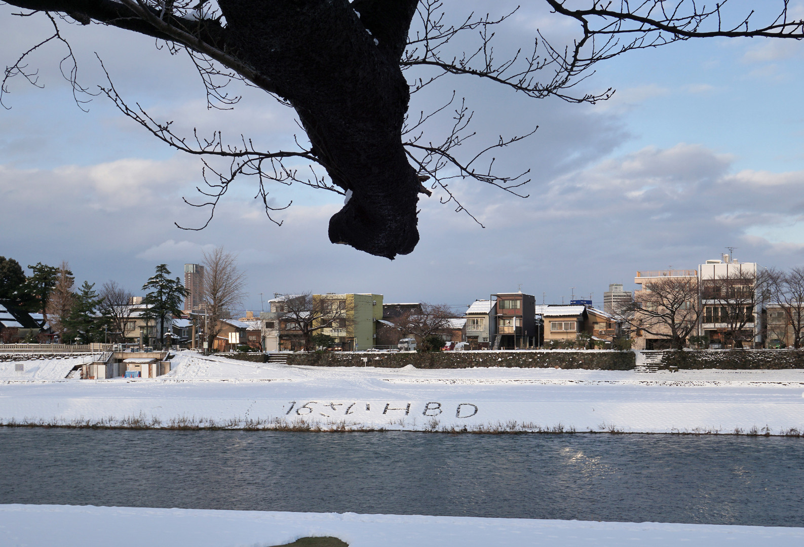 雪の川べりを散歩してると、向こう岸に何やら大きなメッセージが!? 16さいHBD と誰かが足跡で書いていました。 いいな、おめでとう!