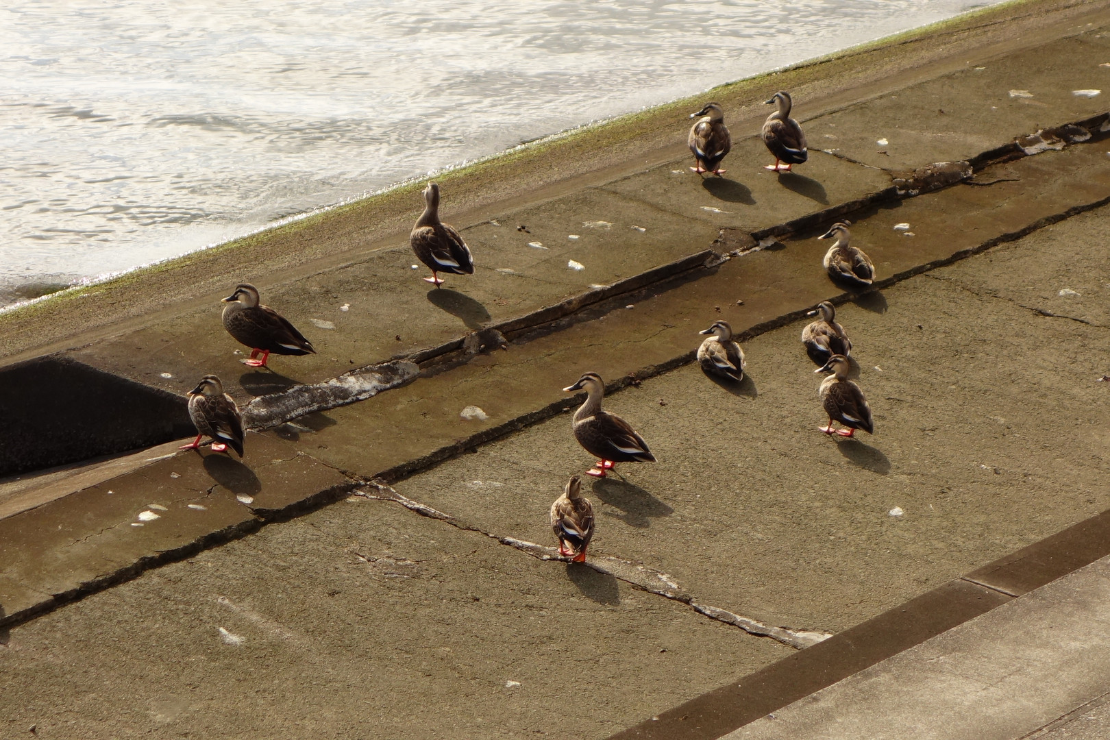 いつもいない河川護岸にカモさん達が集団でいました。 移動中の休憩なのかなとも思ったり~ 片足で立って寒さをしのいでます~