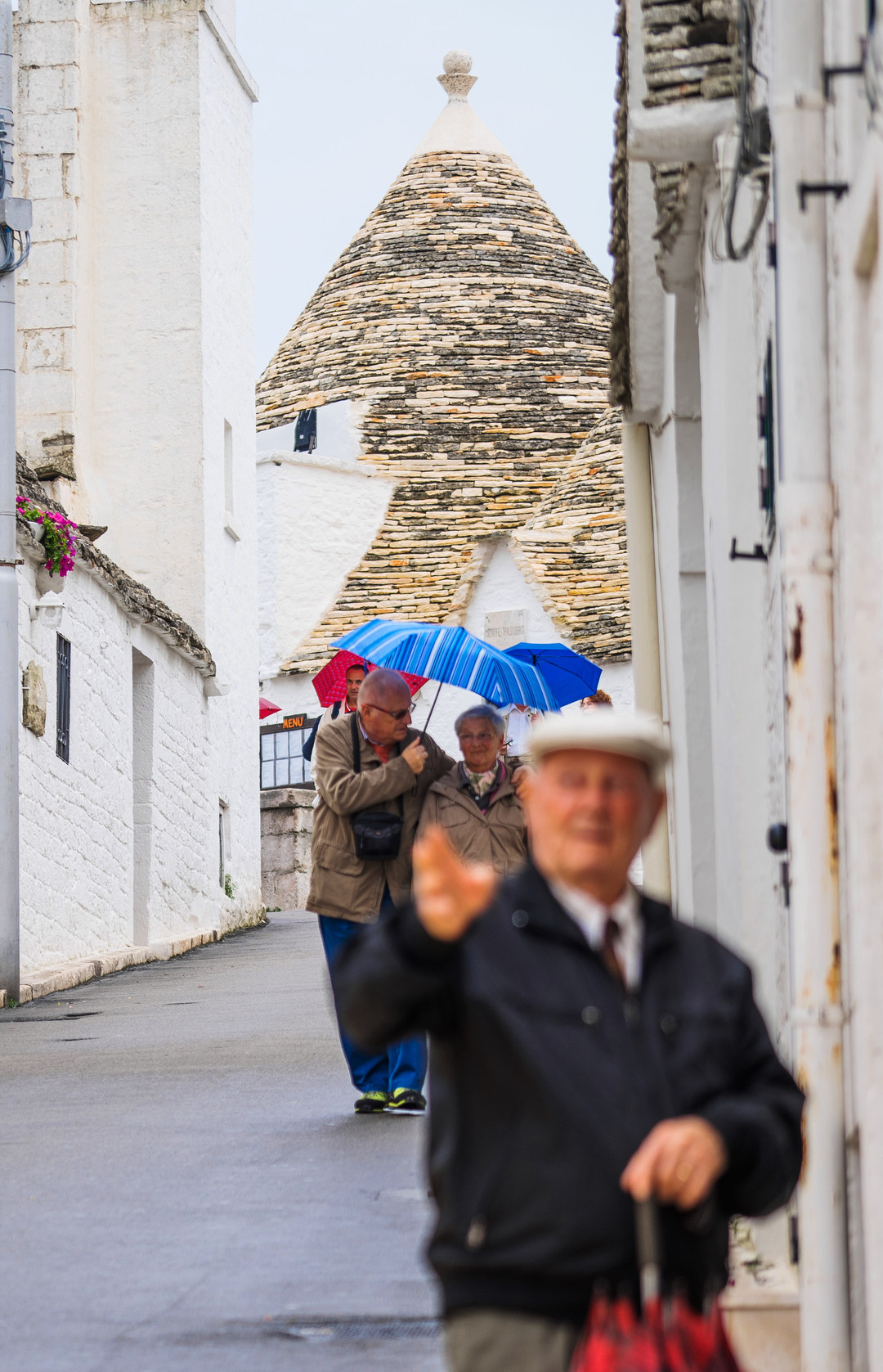 小雨ふるイタリアのアルベロベッロ、妻をいたわるジェントルマン。
