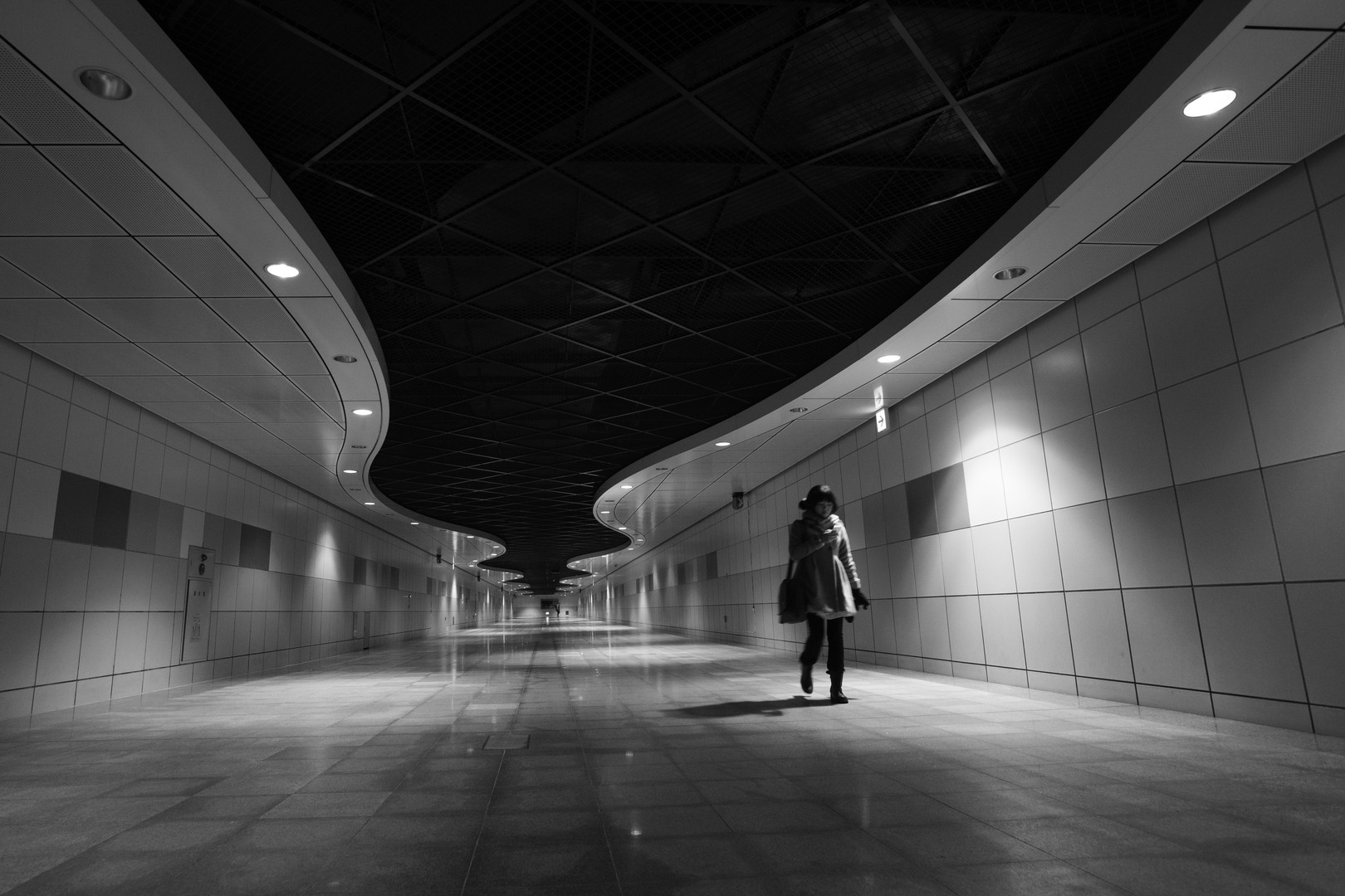 札幌駅構内通路にこんな素敵な撮影スポットが有ったのに今迄全然気が付きませんでした。人通りも少なくひっそりと静まりかえって居てカメラをセットして誰かが通るのを待っていてやっと撮影・・・。