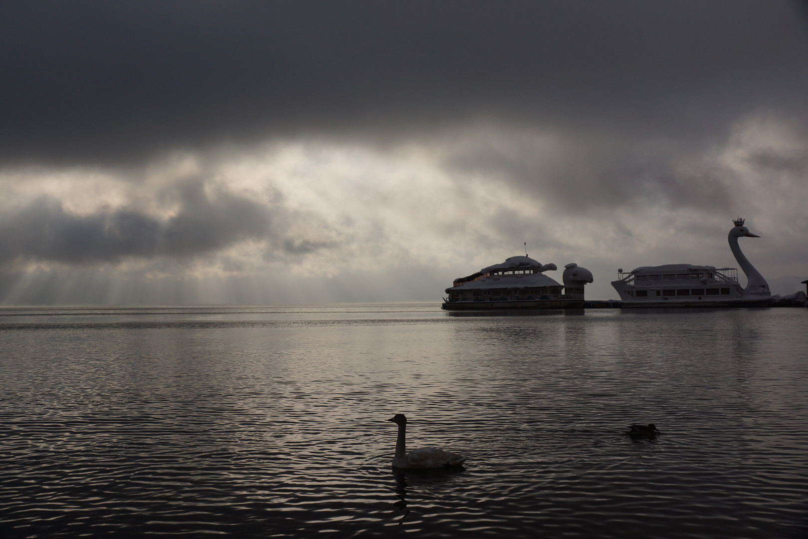 元日の猪苗代湖です。終日雪であった予報から一転して晴れ間が出てきたところで白鳥と共に。