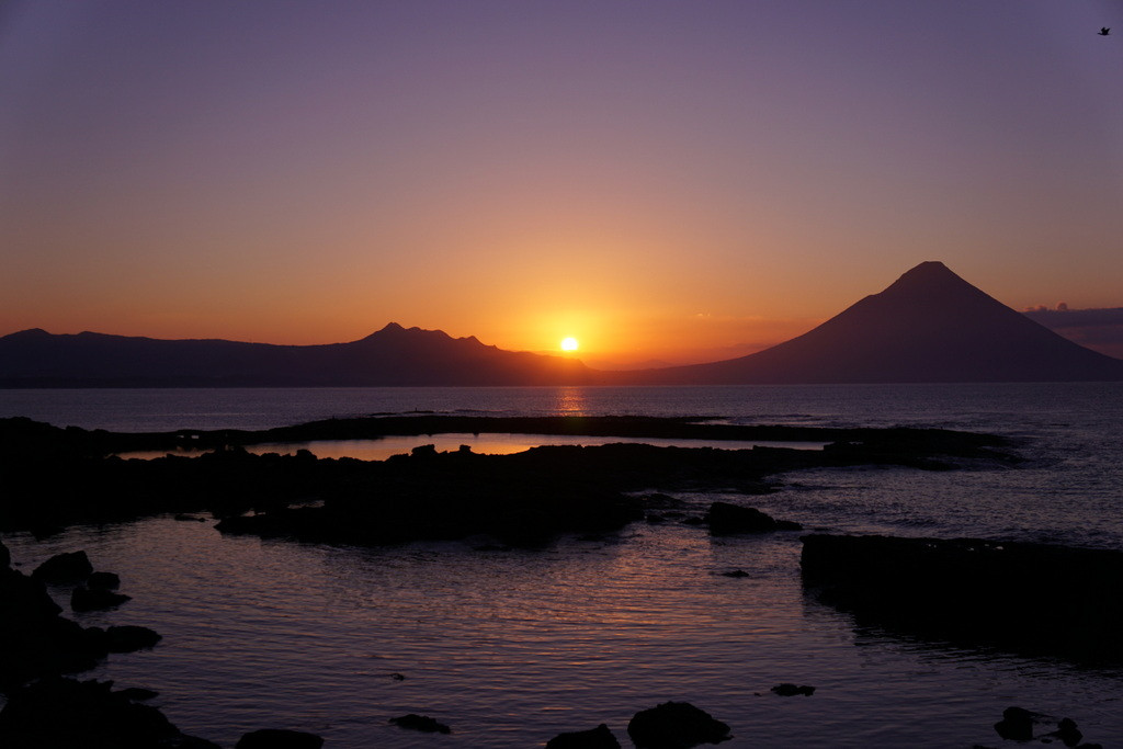 平成27年元旦の年賀状に使用した写真です。相変わらず写真的には未熟ですが近くには知覧飛行場などがあり、画より受ける印象には複雑な思いがあります。平和な世でありますようにとの願いも含めたつもりです。写したのは11月下旬ですが、これから徐々に太陽は北側(写真では左側)に移動し開聞岳のシルエットがきれいに入らなくなります。この時は好天に恵まれ、南側(写真では右側)彼方に屋久島も遠望できました。