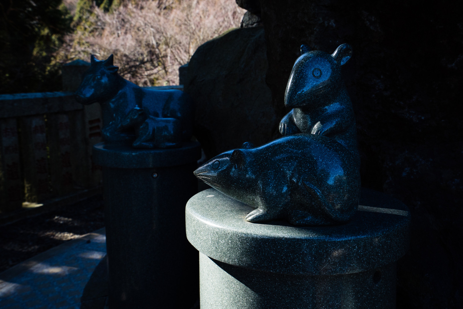富士山の岩を用いて復興された五頭からなる大山獅子です。周りには十二支も配されております。ネズミ年生まれなもので(^^)v