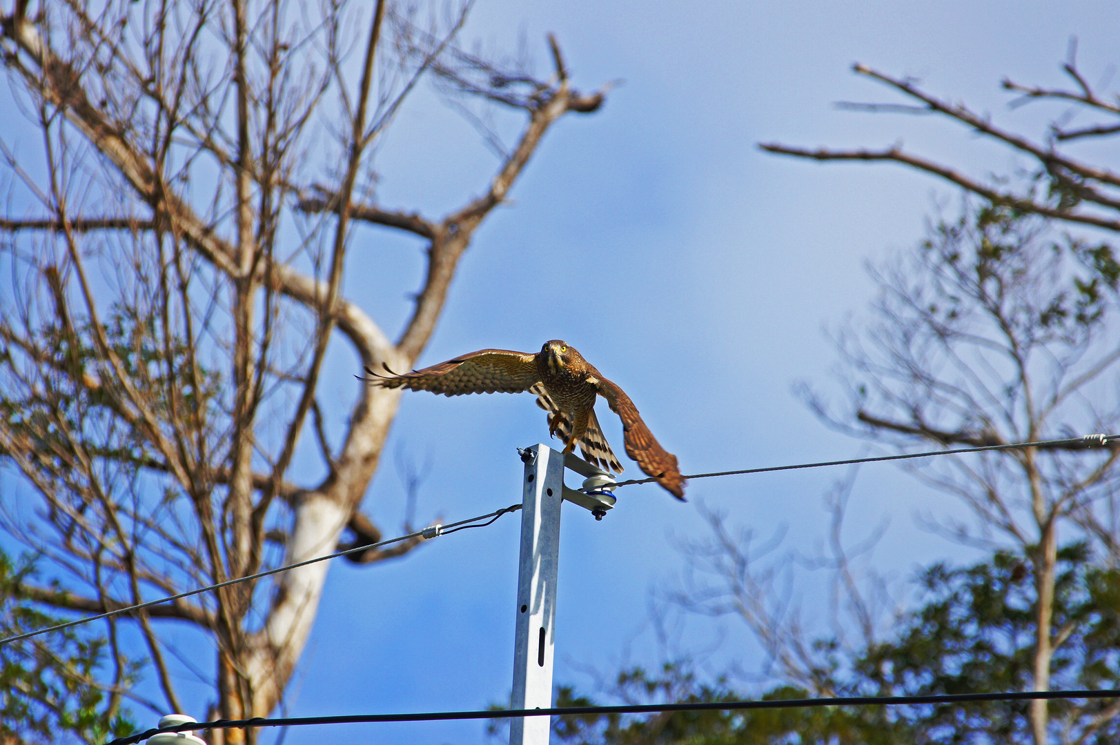 奄美大島より 車に驚いて飛び立つサシバ 緑豊かな山々は、松くい虫対策で伐採されました(松の木) 渡ってきたサシバが一番驚いていることでしょう…