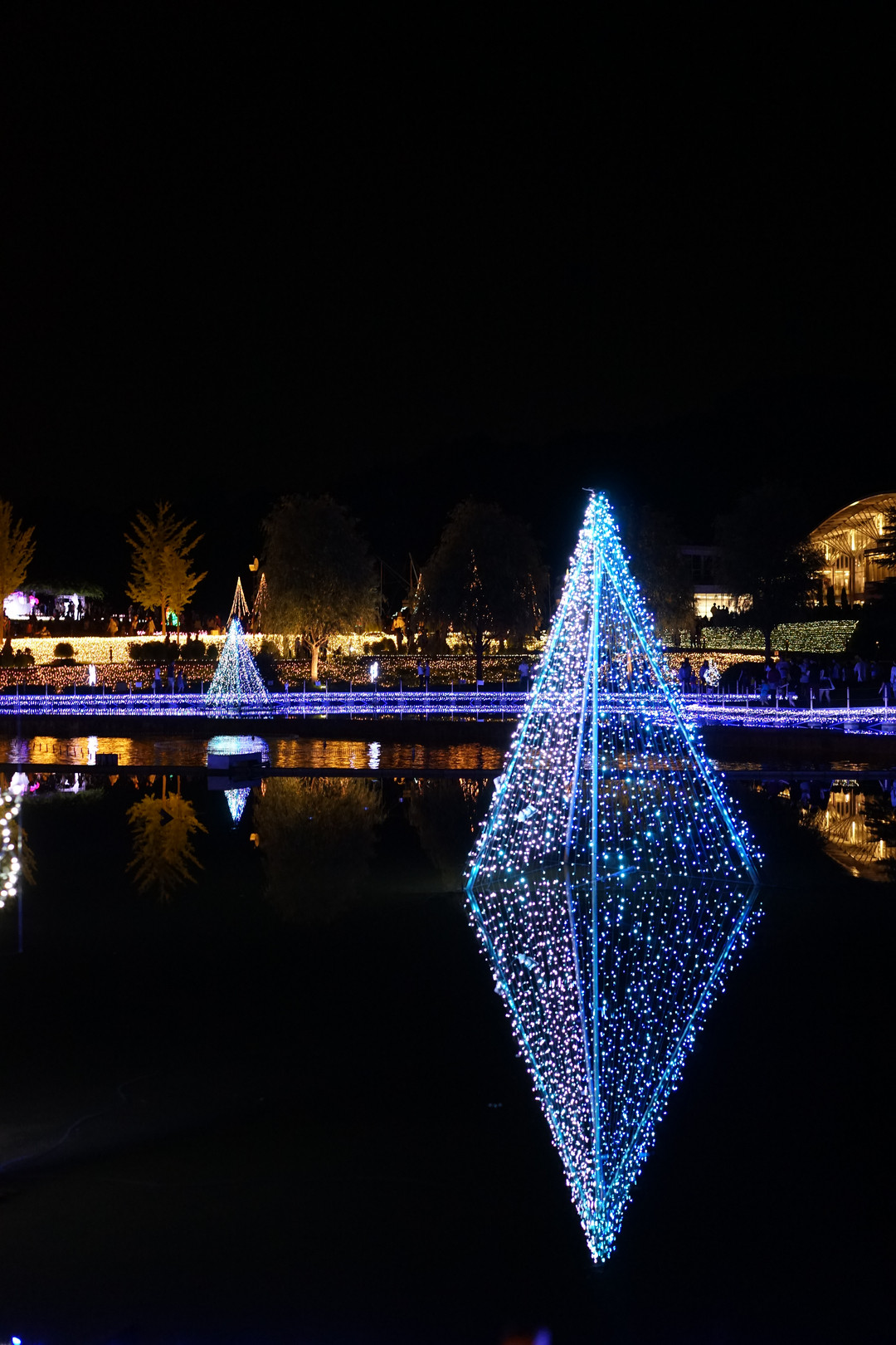 昨夏の長岡での一枚です。 池の淵と水上にもいくつかイルミネーションが並んでおり、ちょうど風が止んで水面にきれいに反射している瞬間をとらえました。