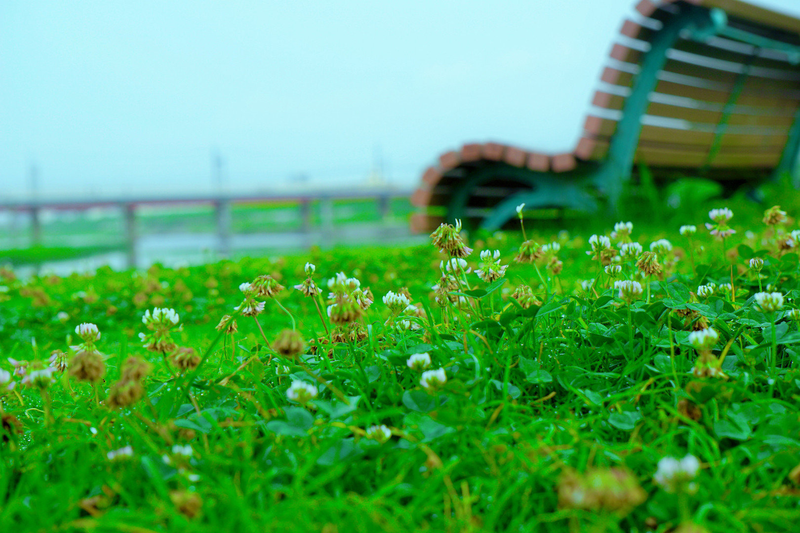 早朝の公園に広がる鮮やかな緑の景色。 草花は目覚めが早いものだ。