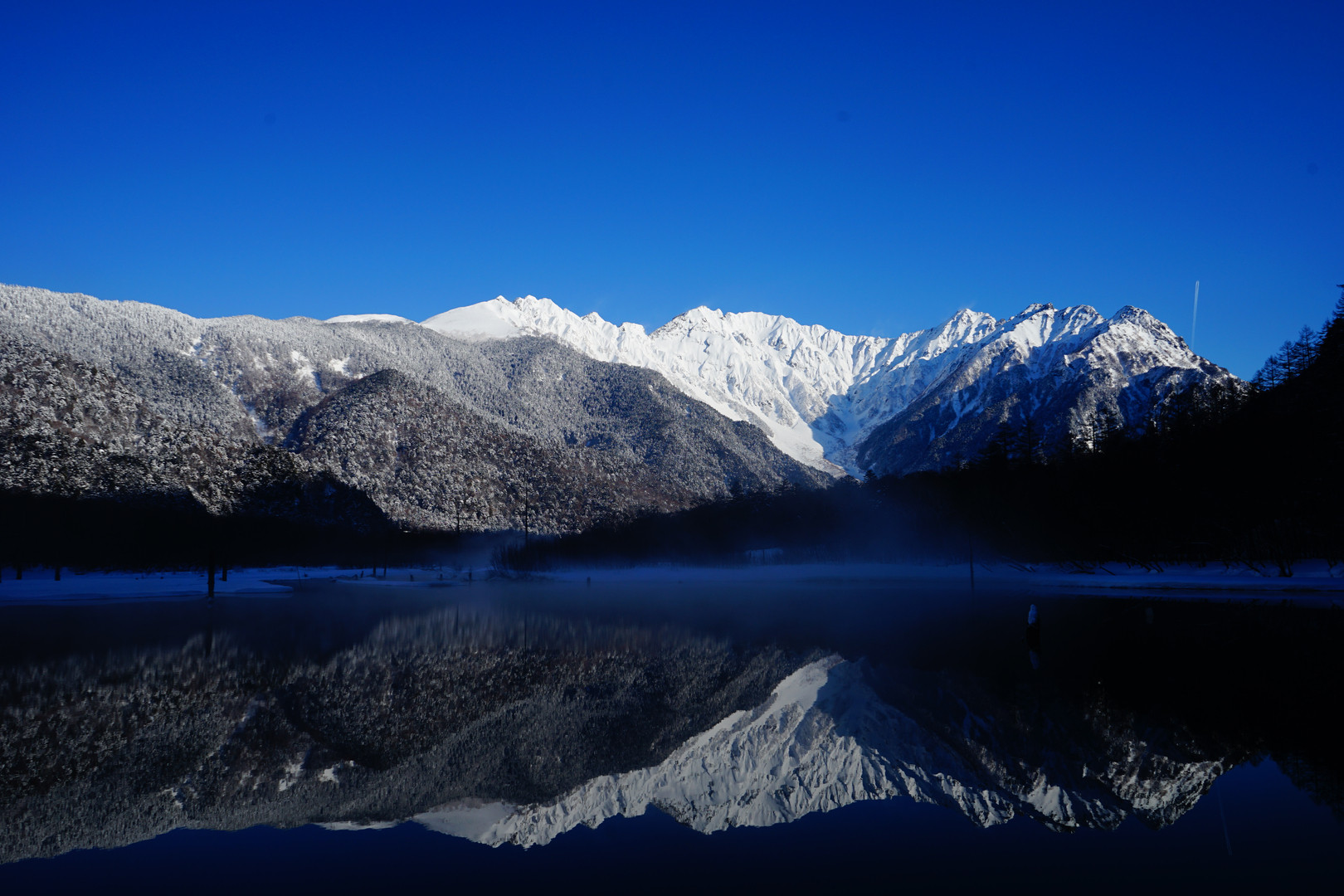 まだ朝霧が残る朝イチの大正池です。夏は簡単に見れるこの景色、この時期はひたすらヒ~コラ歩いてやっとこさ辿り着く絶景です。