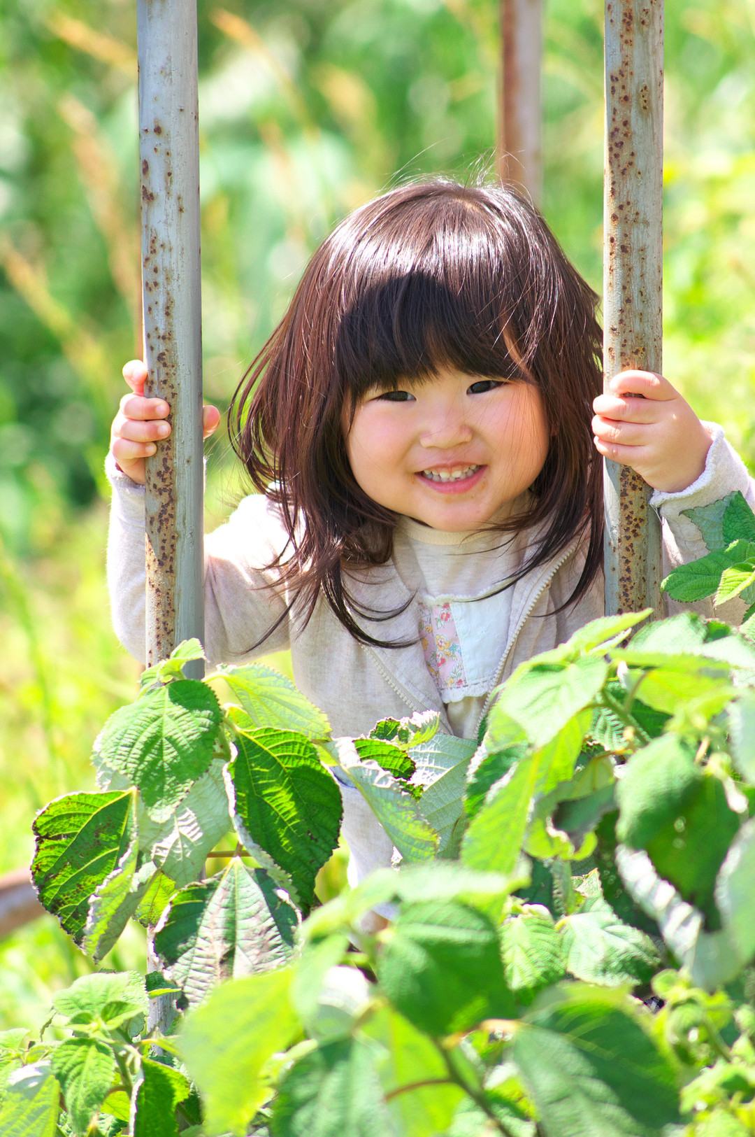 若葉生い茂る階段でかくれんぼ かくれたいけど、がまんできずに…こんにちは
