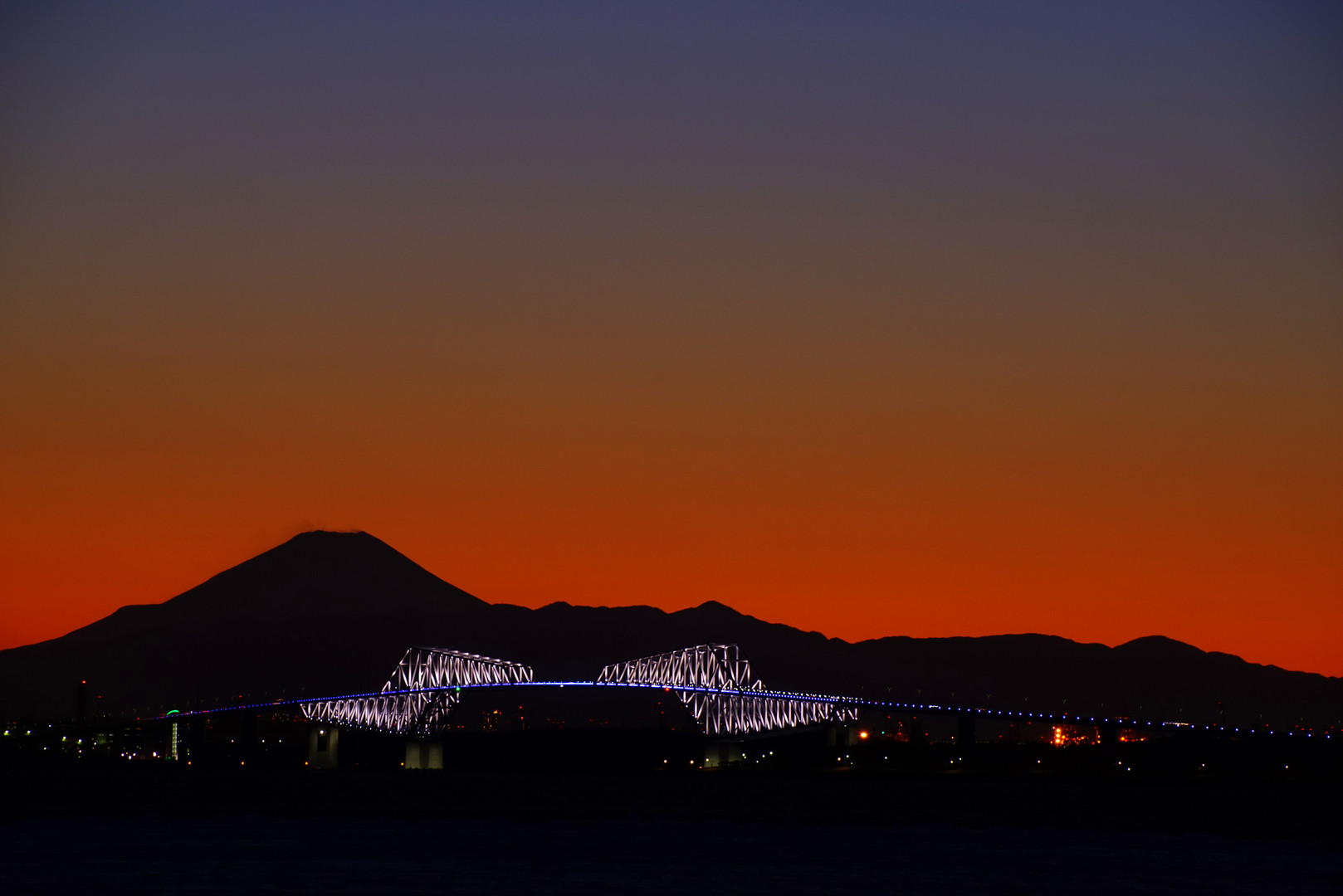 マジックアワーの富士山と東京ゲートブリッジ。 初めて、舞浜からの富士山と東京ゲートブリッジの撮影に行きましたが、まさに”夢の国”。 三脚でカメラを固定しても、MFでピントあわせをする際もレンズが微ブレして旨くピントあわせができないほどの強風でした。ただ、そのお陰で富士山のシルエットはとても綺麗でした。 ISO800でシャッタースピードを少し稼ぎましたが、7Sなら威力を発揮する場面でした。