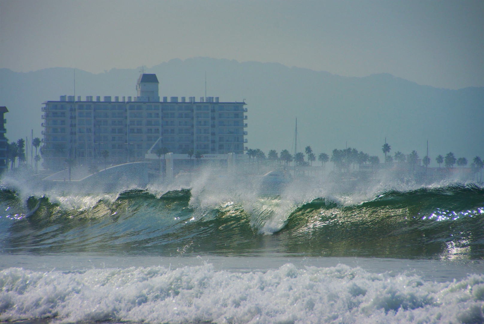 毎日愛犬と散歩をする由比ケ浜の波越しに、逗子マリーナを臨むショットです。