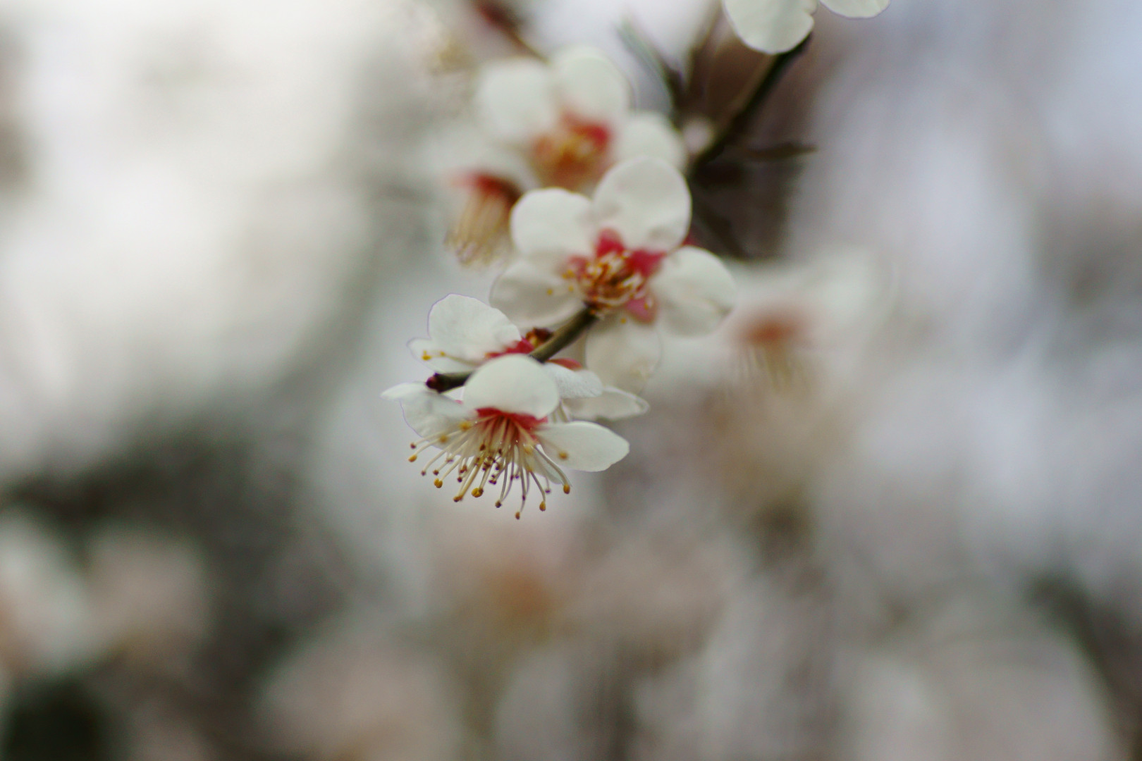 白い梅、バックも白で目立ちません。 白と紅は、咲く時期が少しずれてます。 実は同じに見える。
