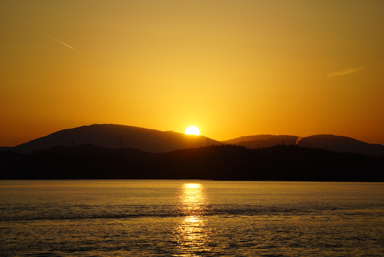 雲ひとつない空に夕日を撮影したくて海水浴場に行きました。 明日から天気が下り坂なので飛行機雲も見えてます。