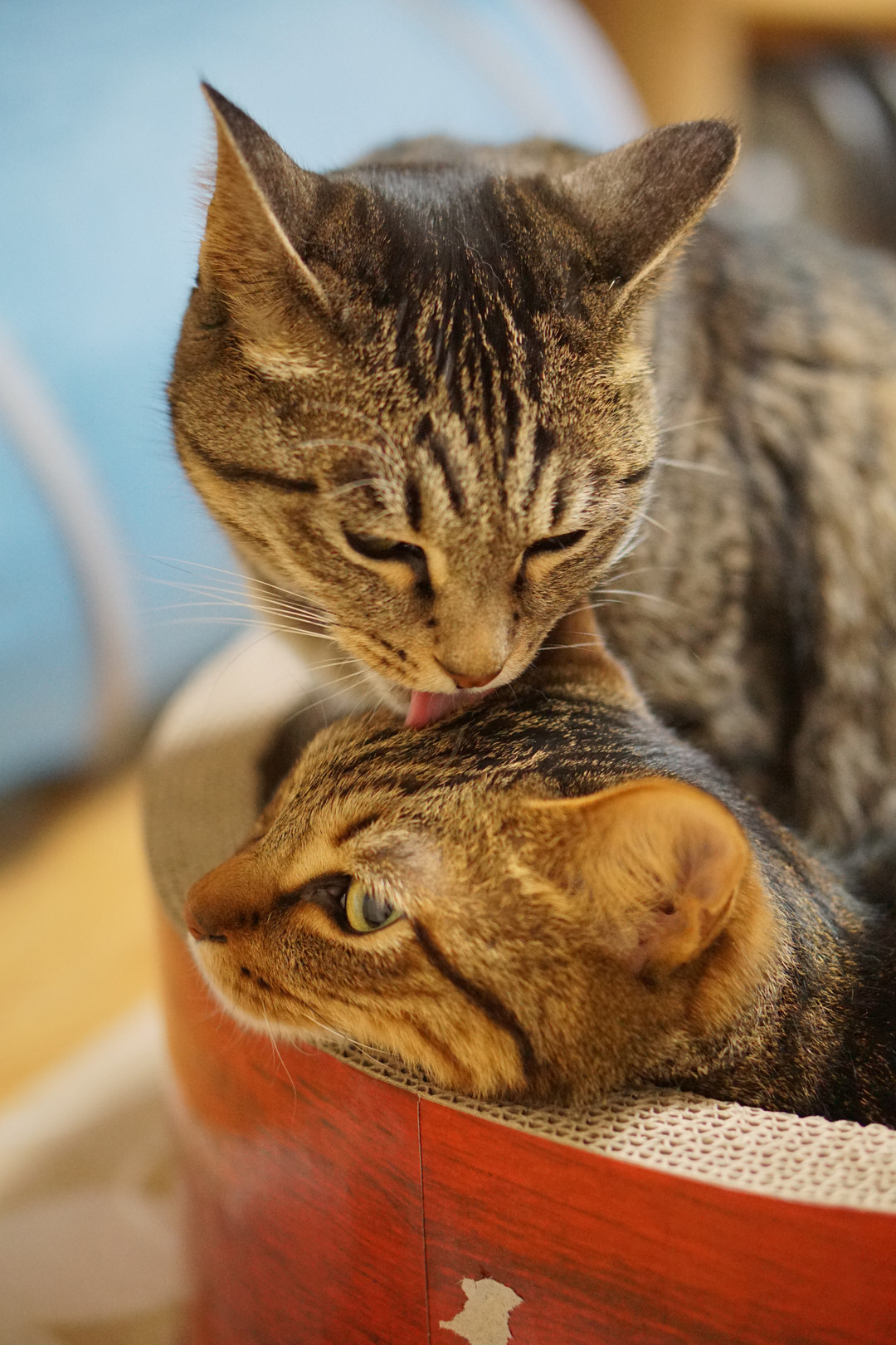 家の猫に爪とぎができるダンボールハウスを買ってあげた日の、中でとってもくつろいでいる瞬間の風景です。