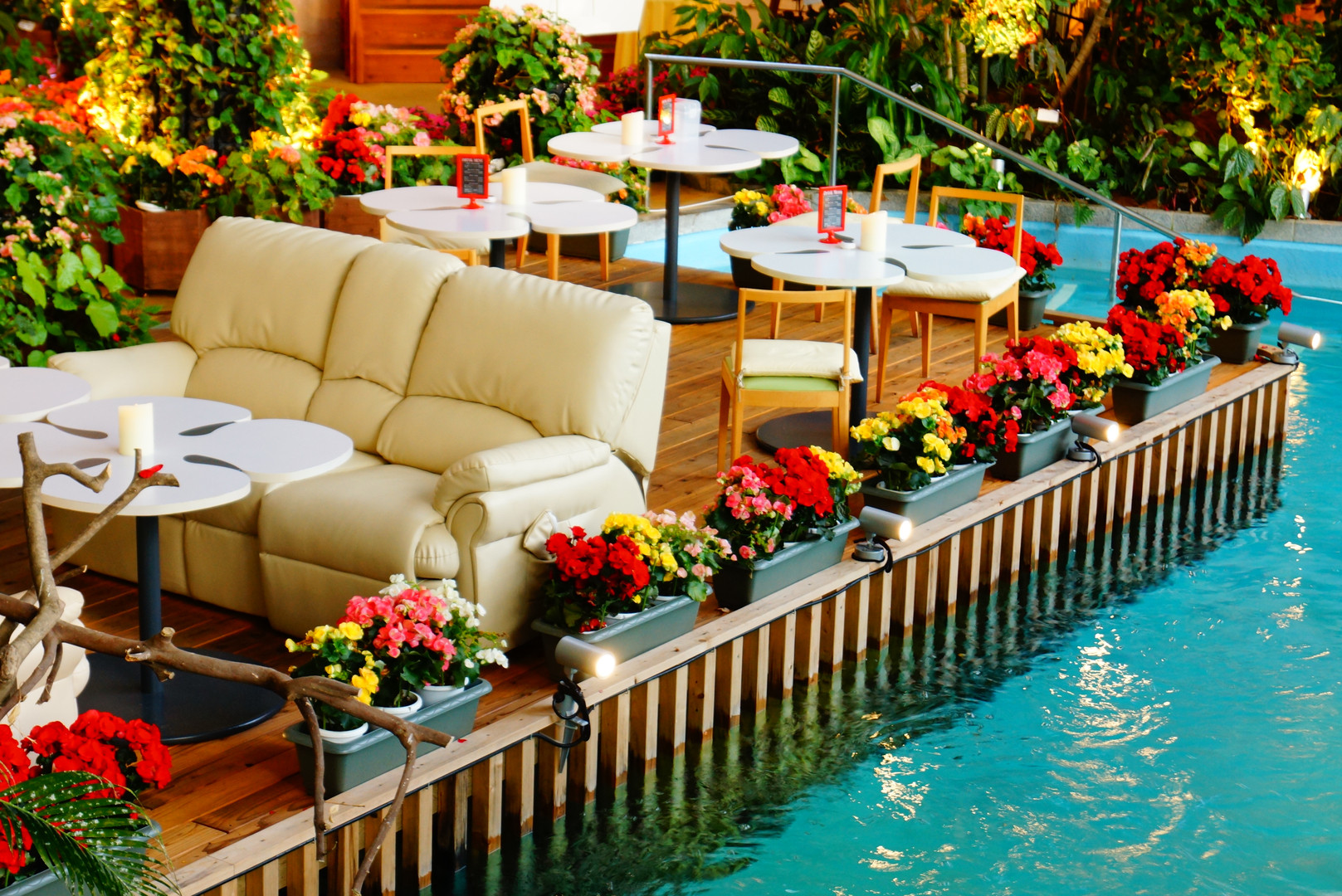 水の青と花の鮮やかさ木のぬくもりがとてもすてきだなと 思って撮りました!