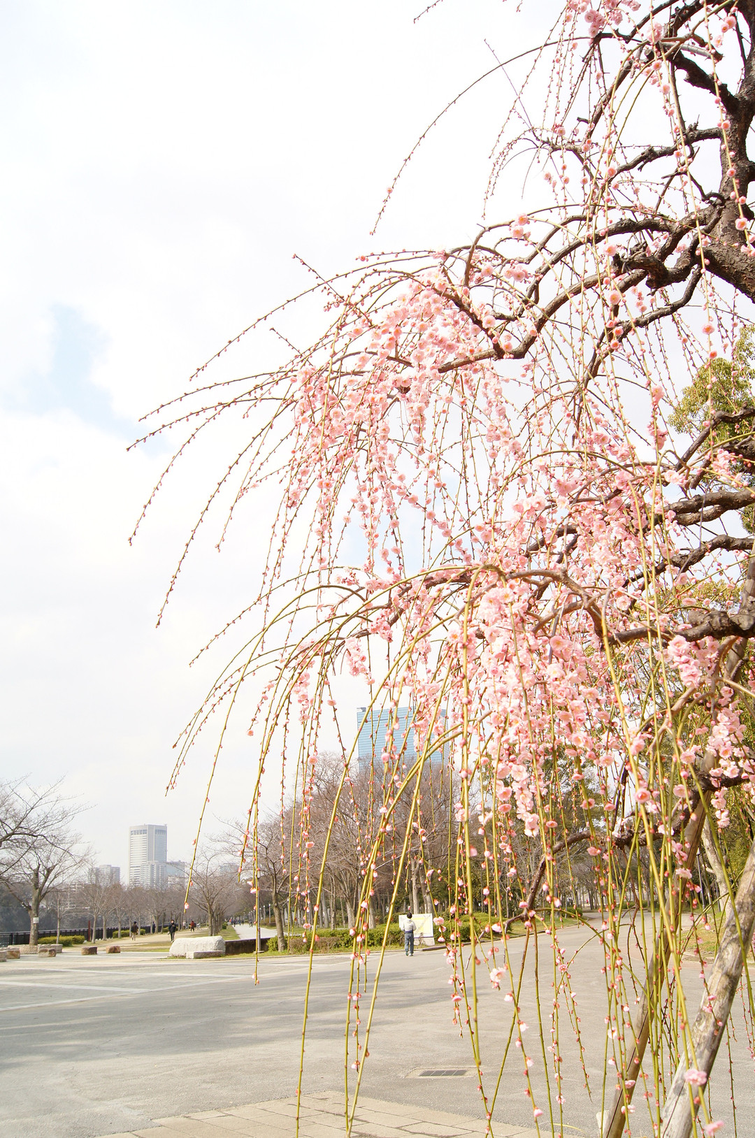大阪城梅林へ行く途中の、しだれ梅です いつも早咲きで、梅見物の人たちの目を楽しませてくれます