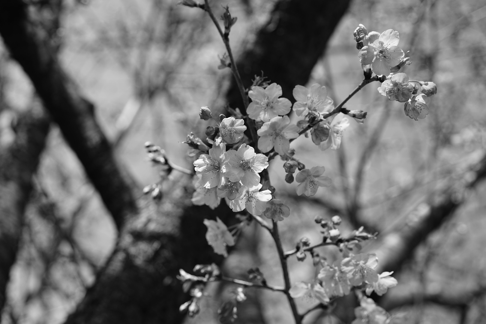 東京都西東京市憩いの森公園で咲いていた桜です。 設定を以前のままにしていたためモノクロで撮影してしまったのですが、カラーとはまた違った桜の美しい一面が撮れたように思います。