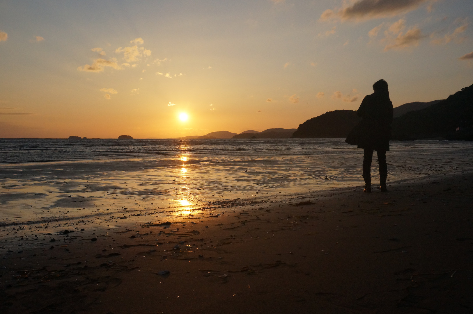 凍える中、終着駅から1時間歩いた甲斐がありました。素敵なカメラ女子と干潟に沈む夕日。いい写真撮れたかな。