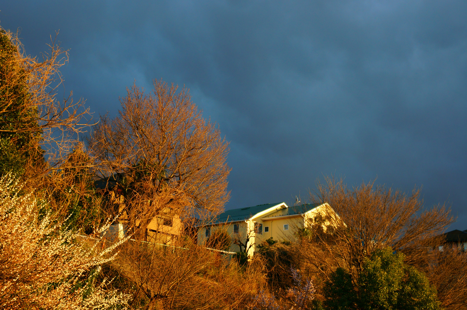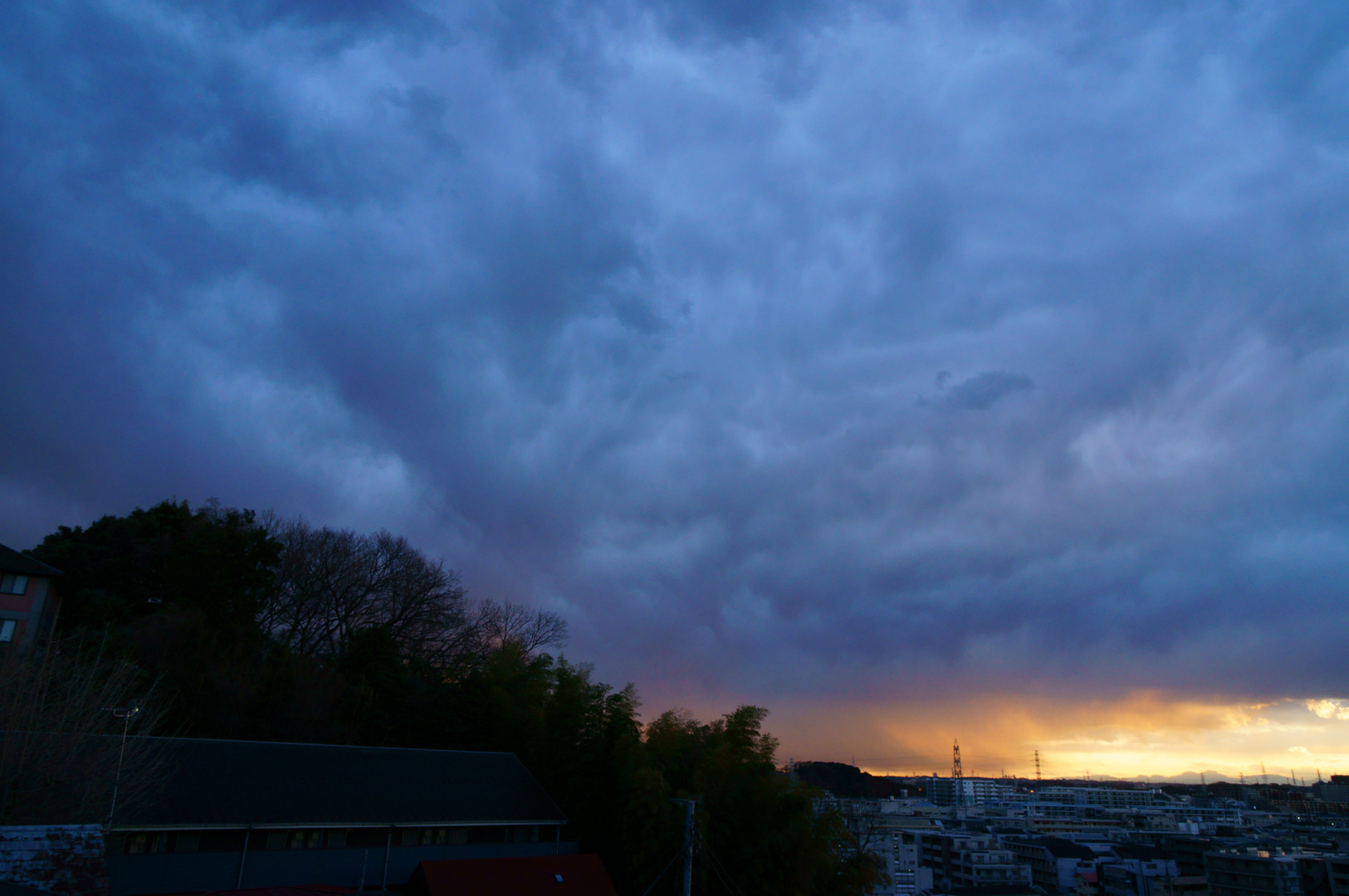 濃い雨雲の帯が断続的に通過して目まぐるしく変わる天候でしたが、日没直前に西の空の雲が切れて、見慣れた風景をちょっと不思議な味付けにしてくれました。