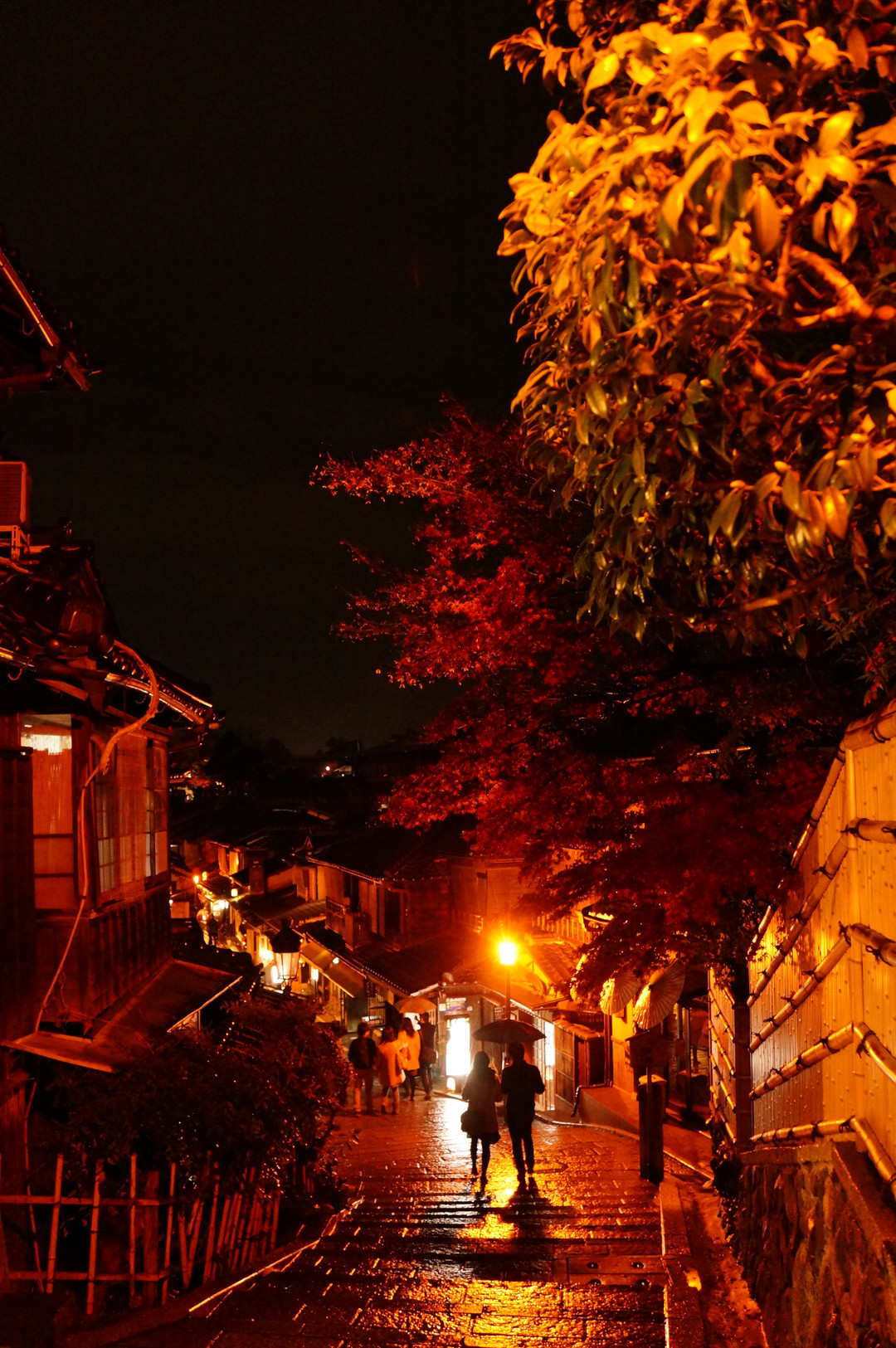 雨の中一つの傘に入る恋人たち オレンジ色のライトが濡れた路面に反射して綺麗だったので 被写体になってもらいました。
