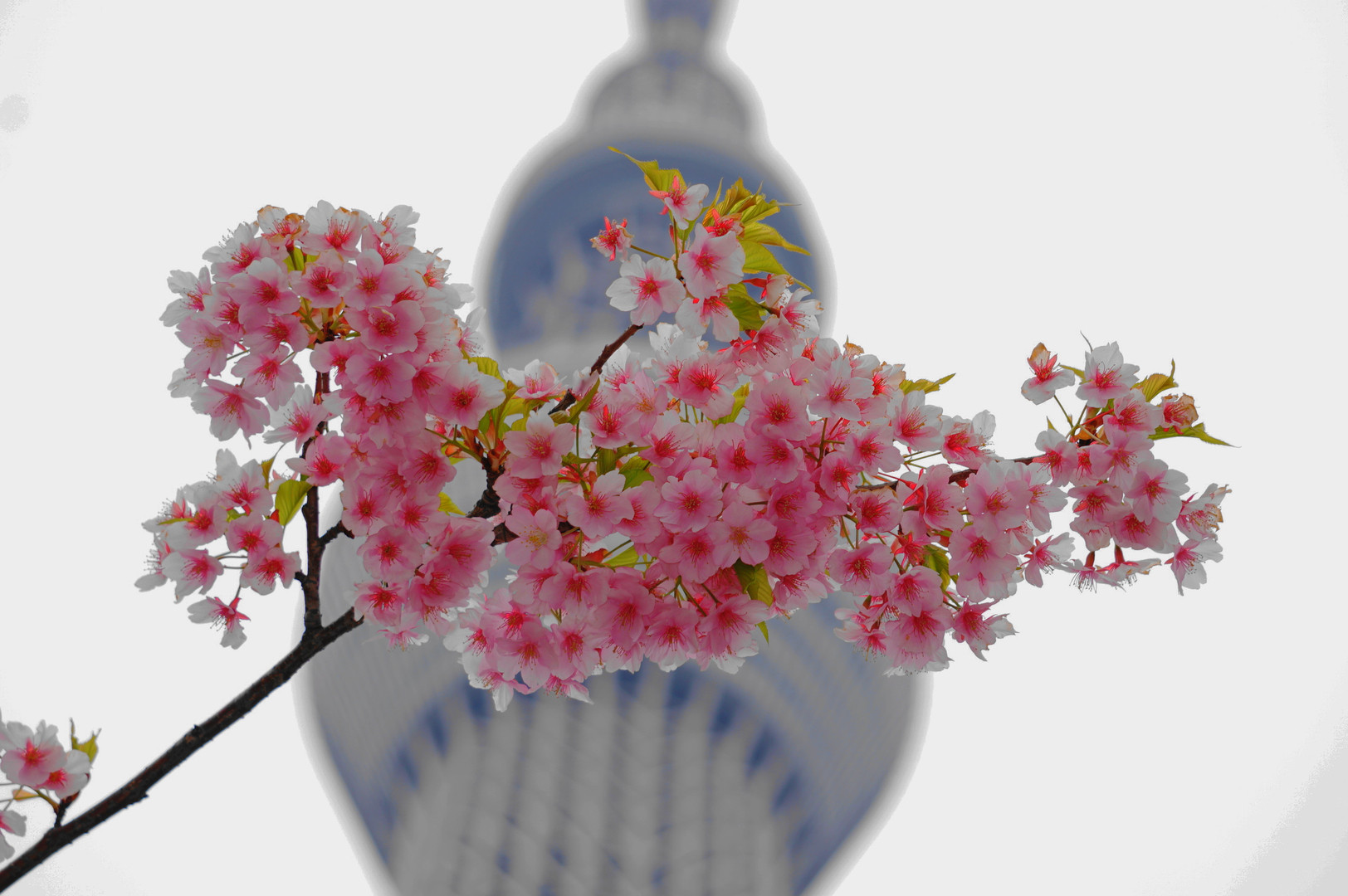 東京スカイツリーの近くに早咲きの桜を発見! 曇り空が画用紙となり、満開の綺麗な桜が撮れました。