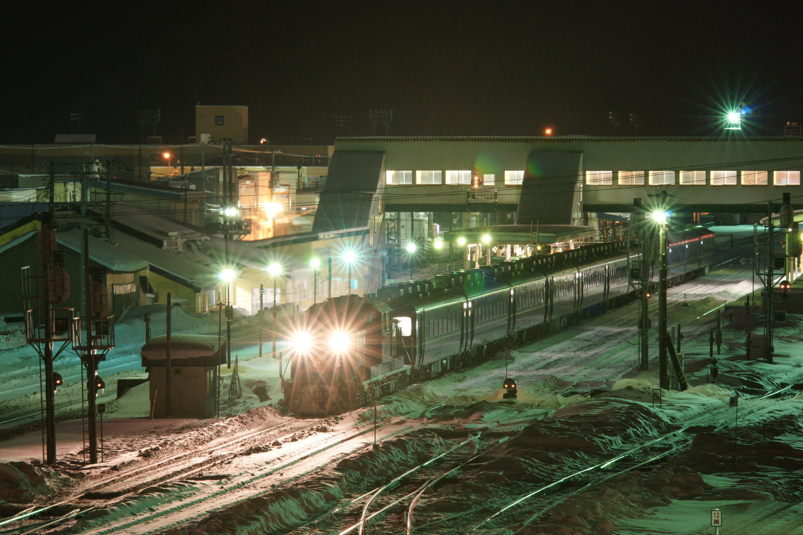 深夜の長万部駅にて。 今夜の札幌行き急行「はまなす」は11両編成