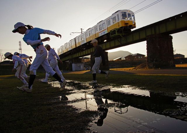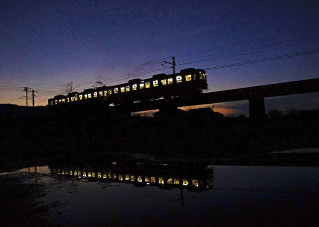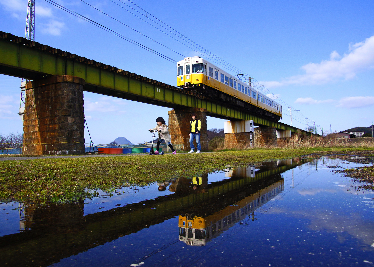 川の中からも撮りたくなりましたが、雨の後限定の河川敷の水溜りも面白いです。