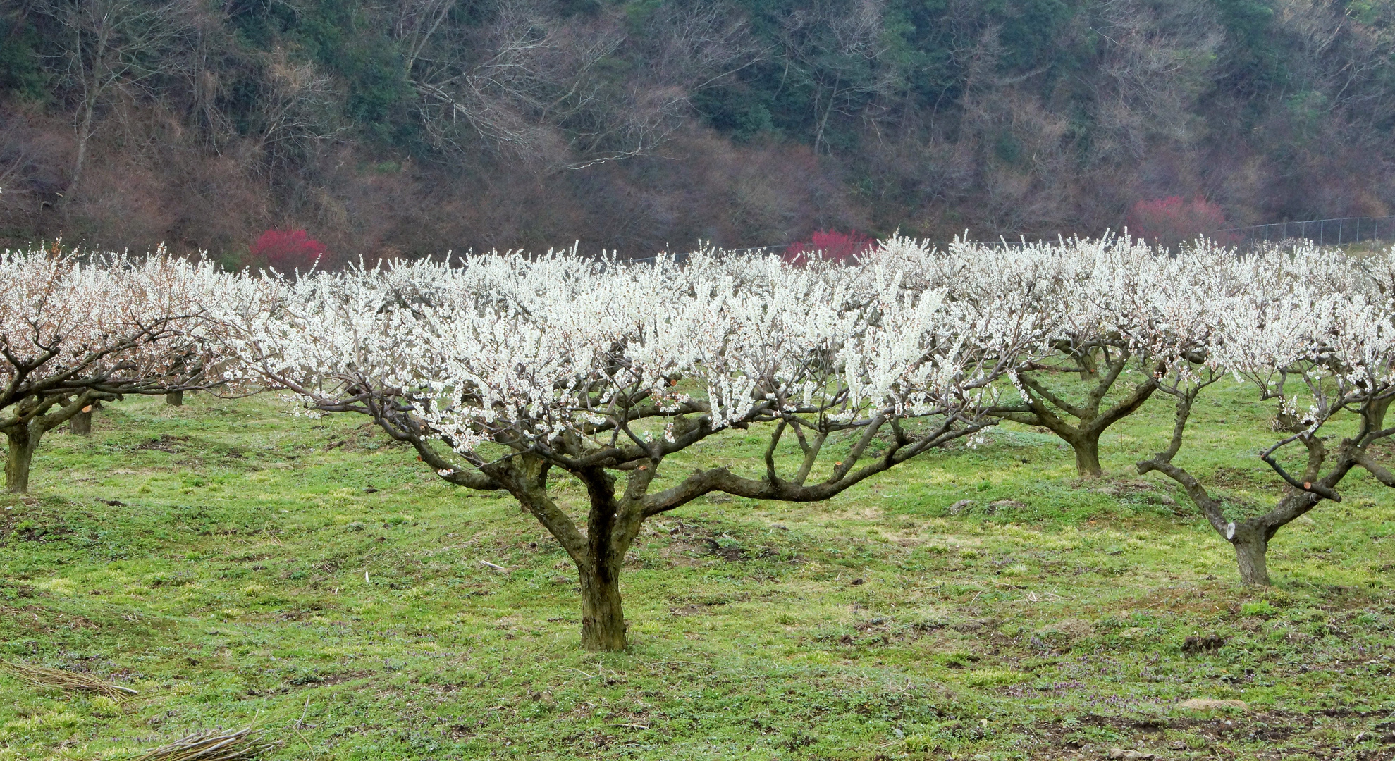 同じ高さに白梅が咲きまるで草原におかれたテーブルを想い撮る。